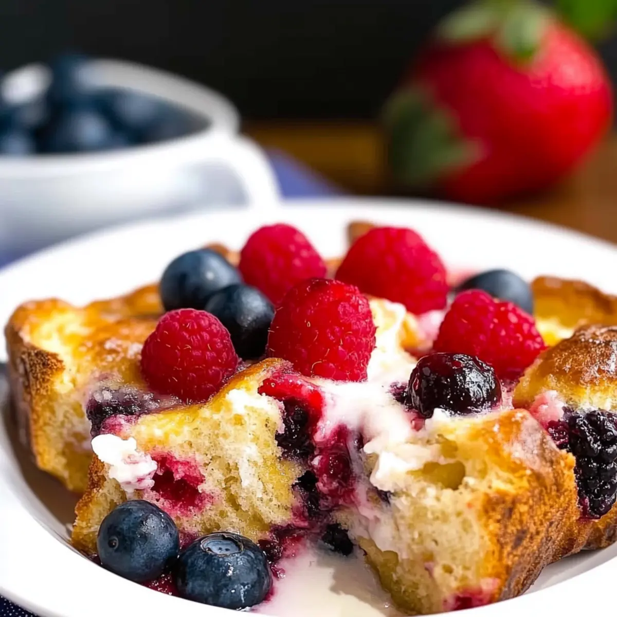 Sprinkle the remaining mixed berries over the top of the assembled pudding, letting them rest on the surface for a beautiful presentation. Place the baking dish in the oven and bake for 55 minutes to 1 hour. You’ll know it’s done when the edges are set, the center slightly jiggles, and the top is lightly golden brown.