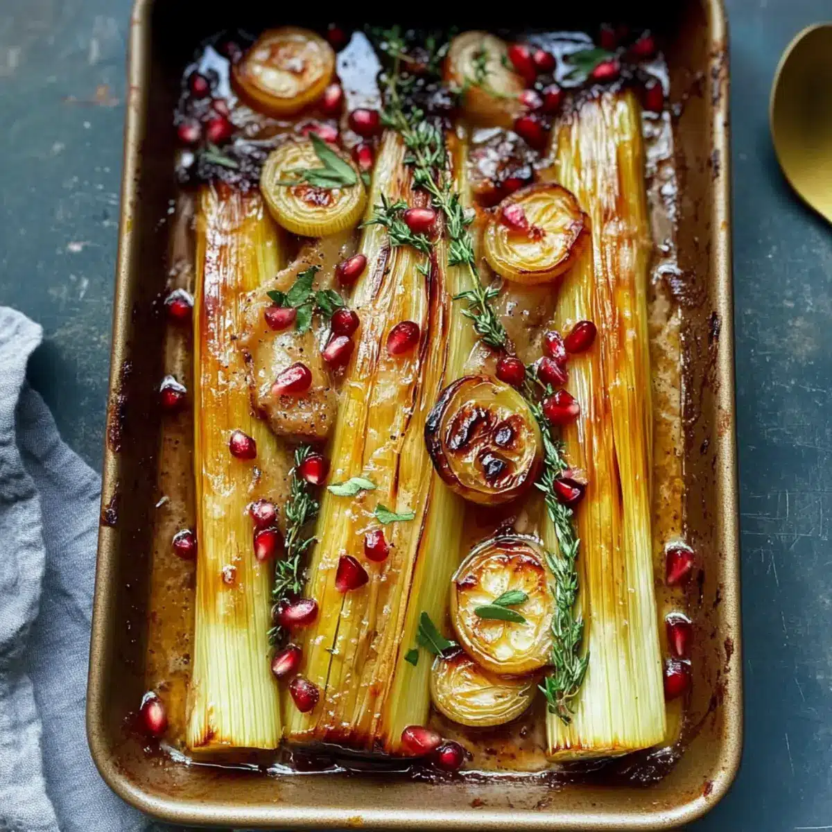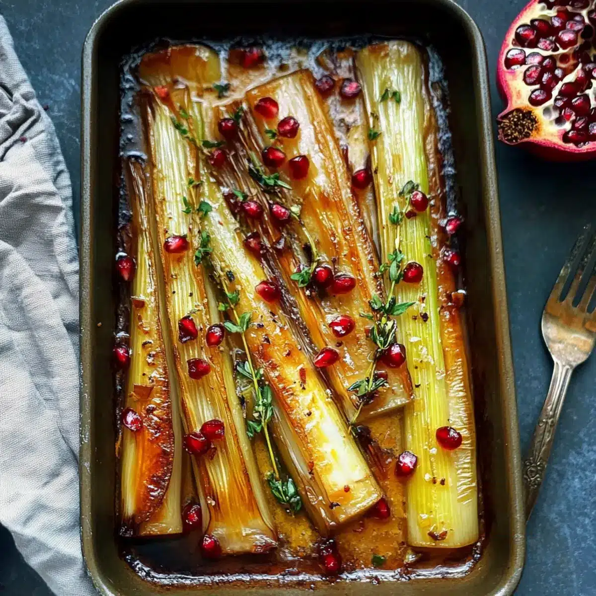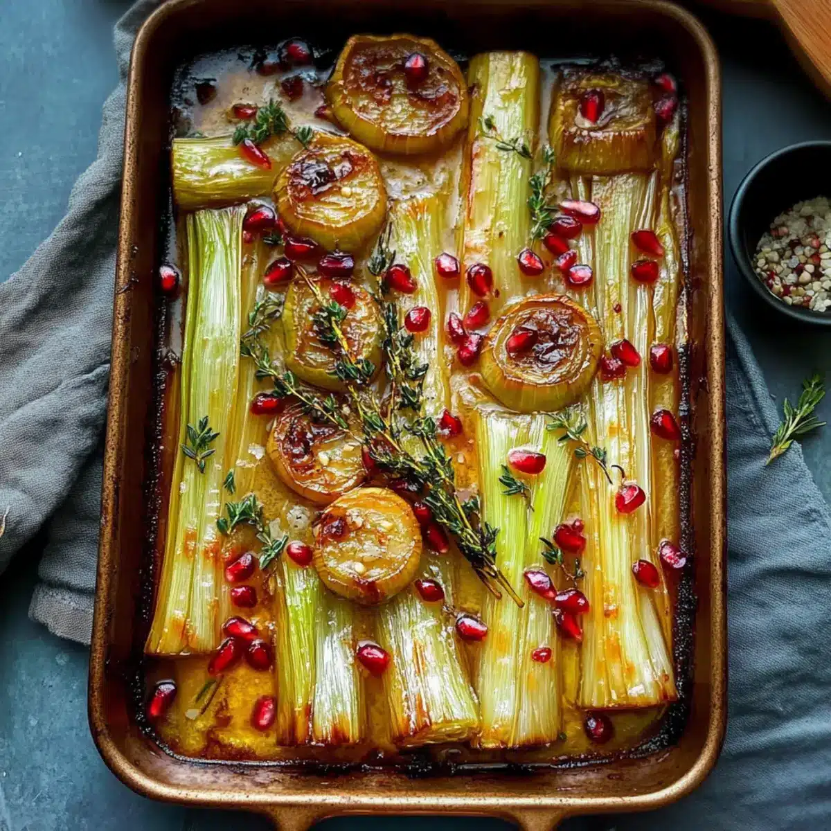 - Once the sauce has thickened, spoon it generously over the leeks in your serving dish. If desired, sprinkle pomegranate seeds for a pop of color. Serve warm.