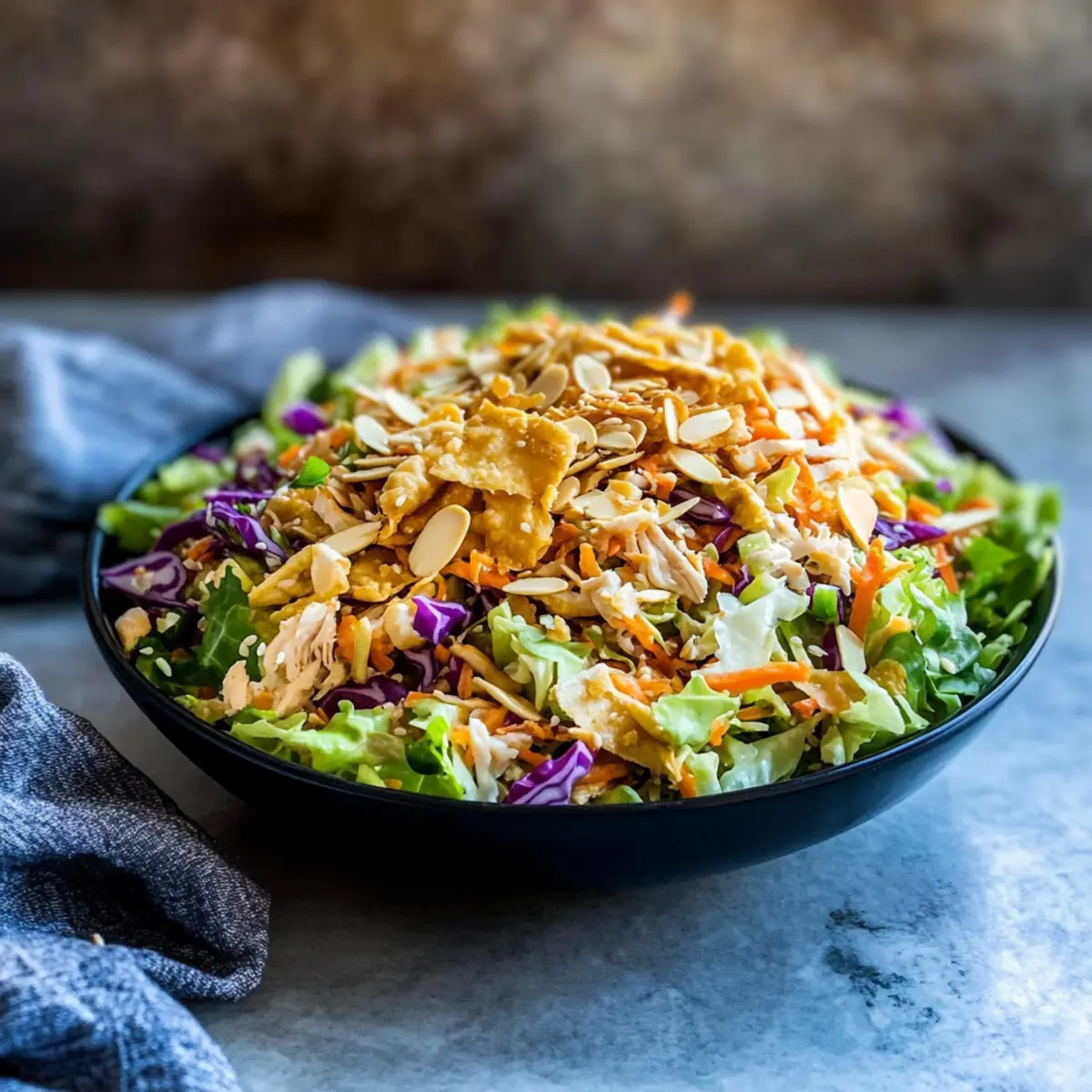 Just before serving, sprinkle a handful of toasted almonds and crispy wonton strips over the top of your salad mix. This step adds essential crunch to your Chinese Chicken Salad and enhances the overall presentation. Aim to do this right before serving to maintain that delightful texture, which takes only about 1 minute.