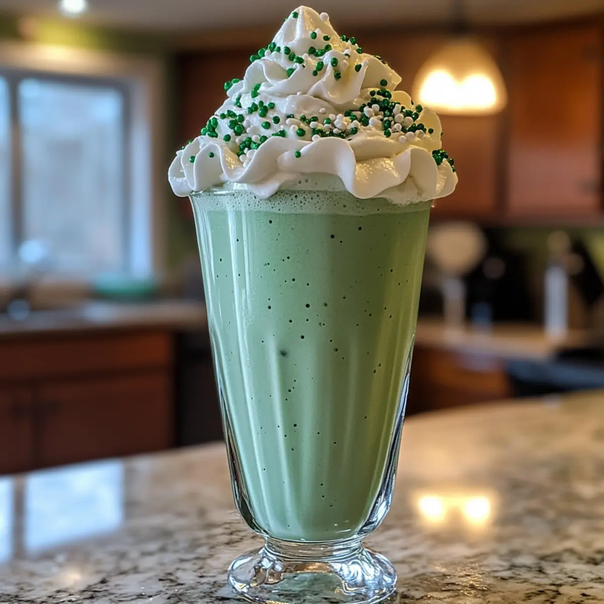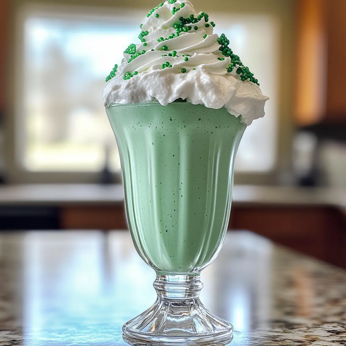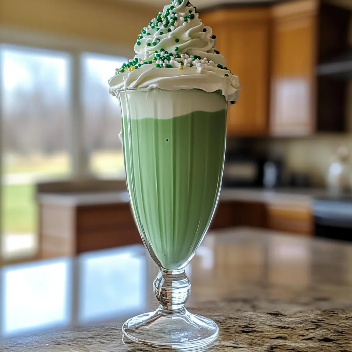 Prepare tall glasses by placing them in the freezer for a few minutes to chill. Once ready, pour the creamy shamrock shake into each glass, filling them about three-quarters full to allow space for toppings. The beautiful, vibrant green color should be refreshing and eye-catching, perfect for St. Patrick’s Day celebrations.