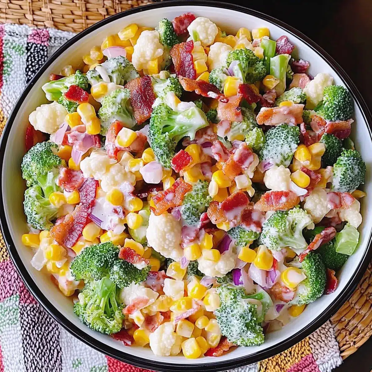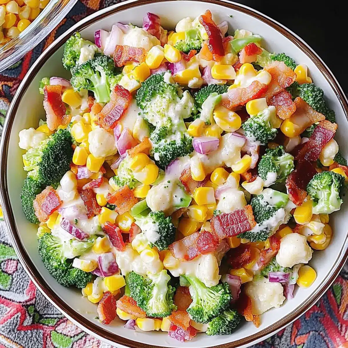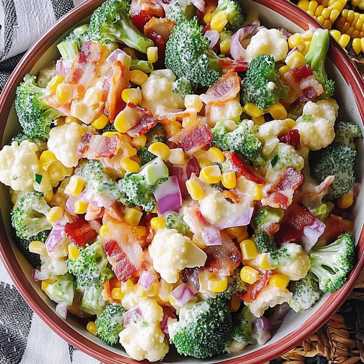 Creamy Broccoli, Cauliflower, Corn, Bacon Salad Bliss