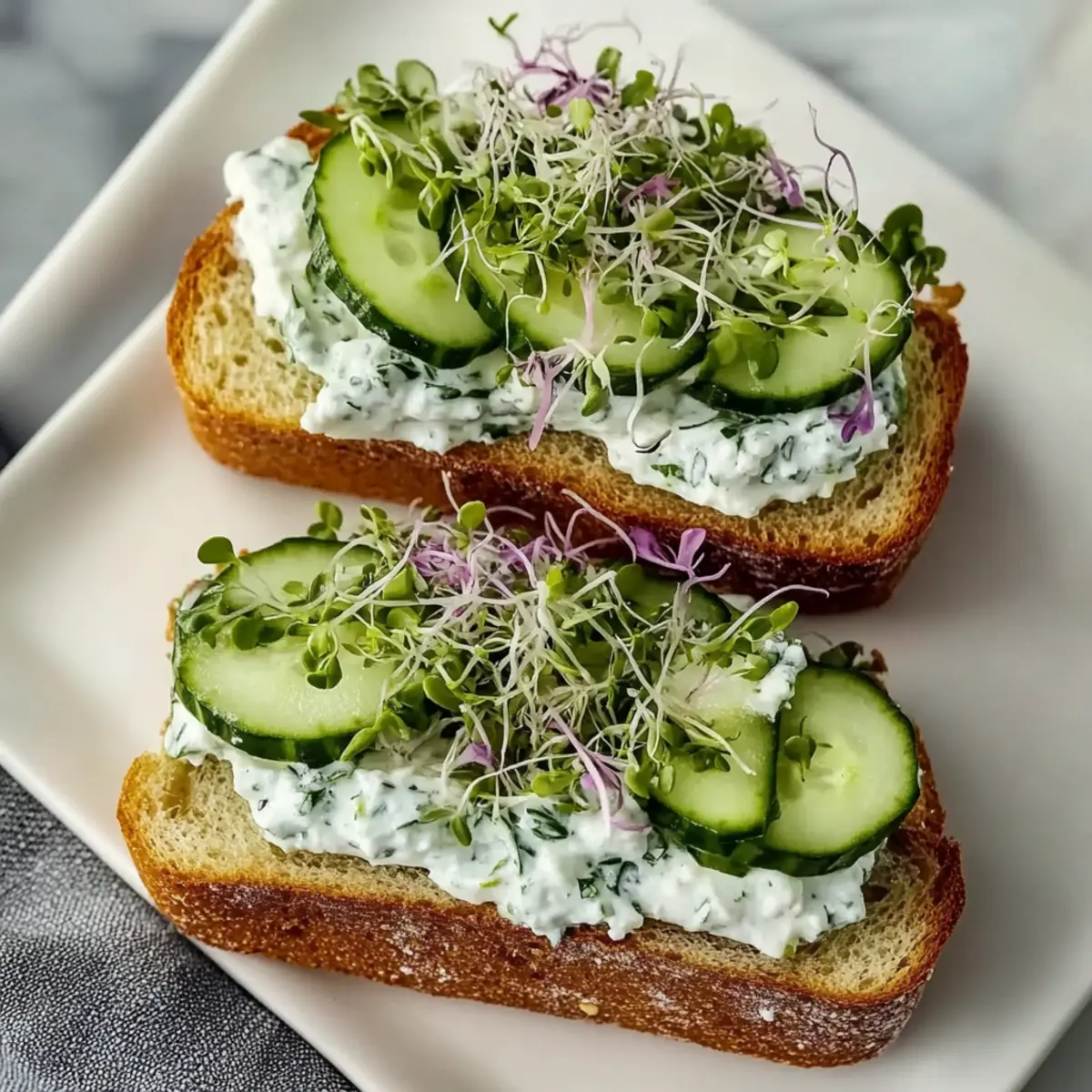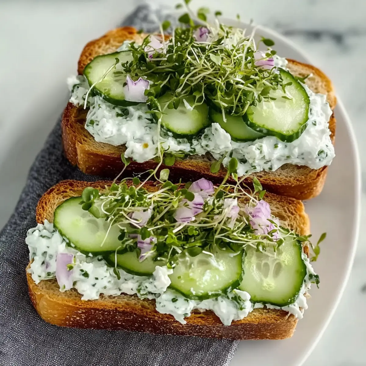 - To assemble, place a slice of sturdy bread down, spread the cucumber mixture over it, add sprouts and onion slices, then top with another slice of bread.