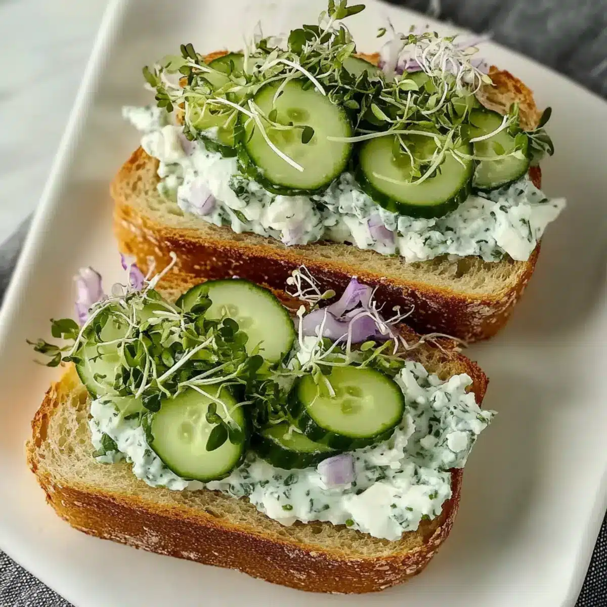 To assemble your cucumber salad sandwiches, start with a slice of your chosen sturdy bread. Spread a generous layer of the cucumber mixture over a handful of sprouts, and if you like it with a bit of spice, add some thin onion slices for extra zing. Top it off with another slice of bread, creating a delightful sandwich that’s both colorful and edible.