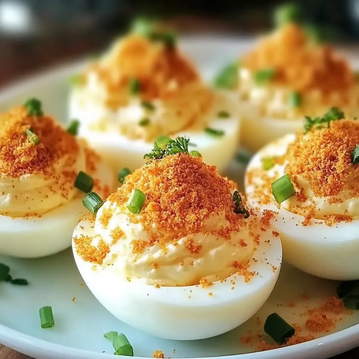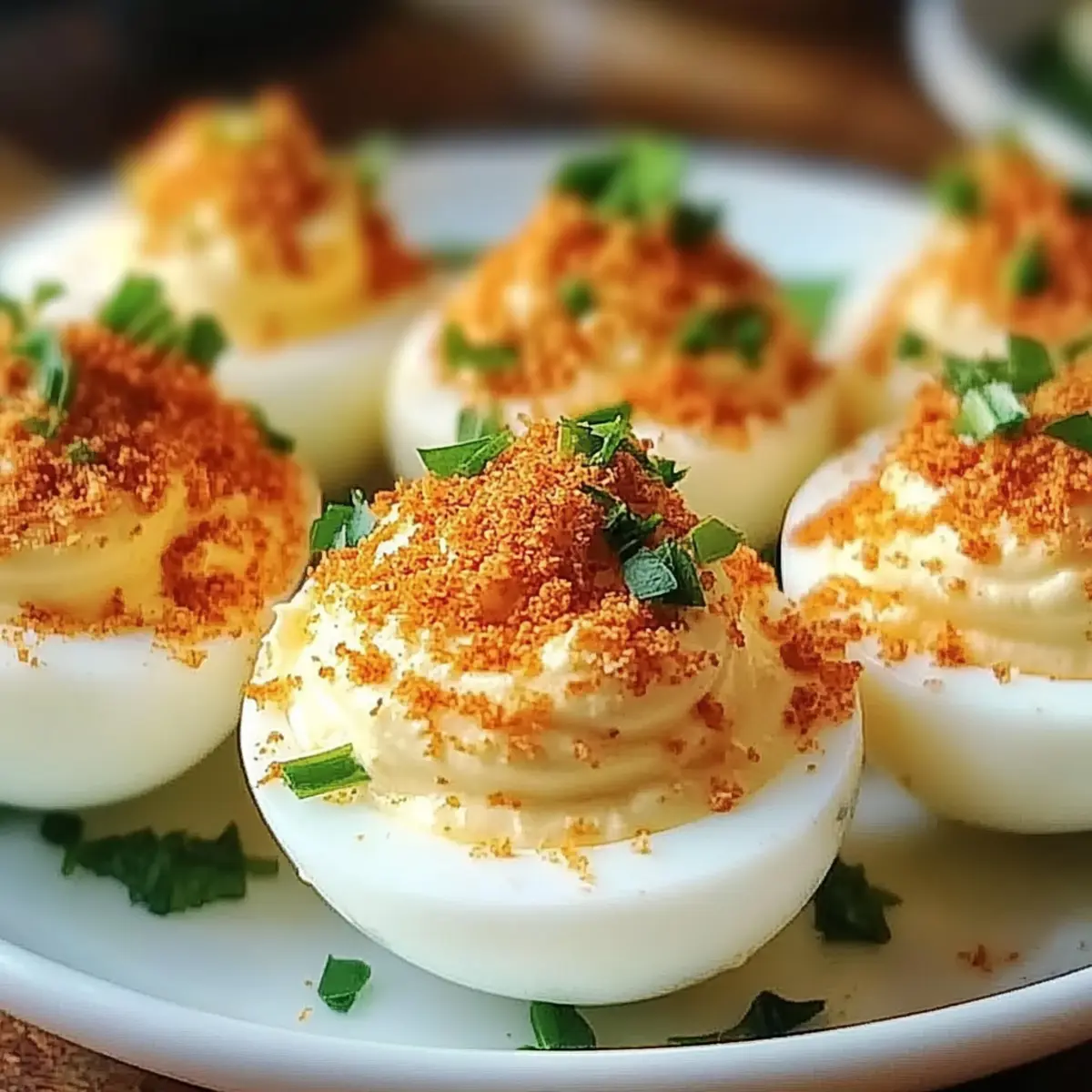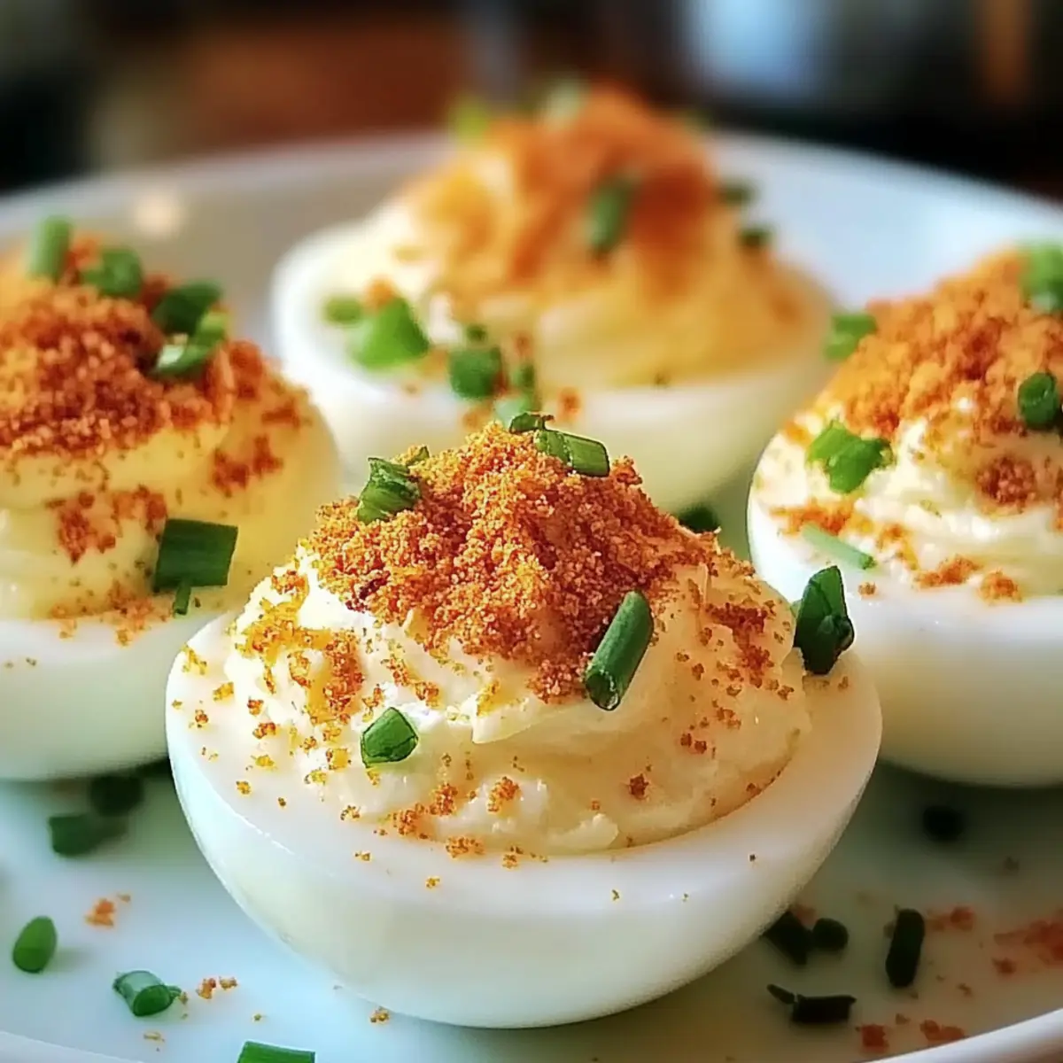 Bacon Topping: Sprinkle crumbled crispy bacon on top for a deliciously salty crunch. The rich flavor of bacon adds a depth that pairs beautifully with the creamy filling, making each egg irresistibly savory.