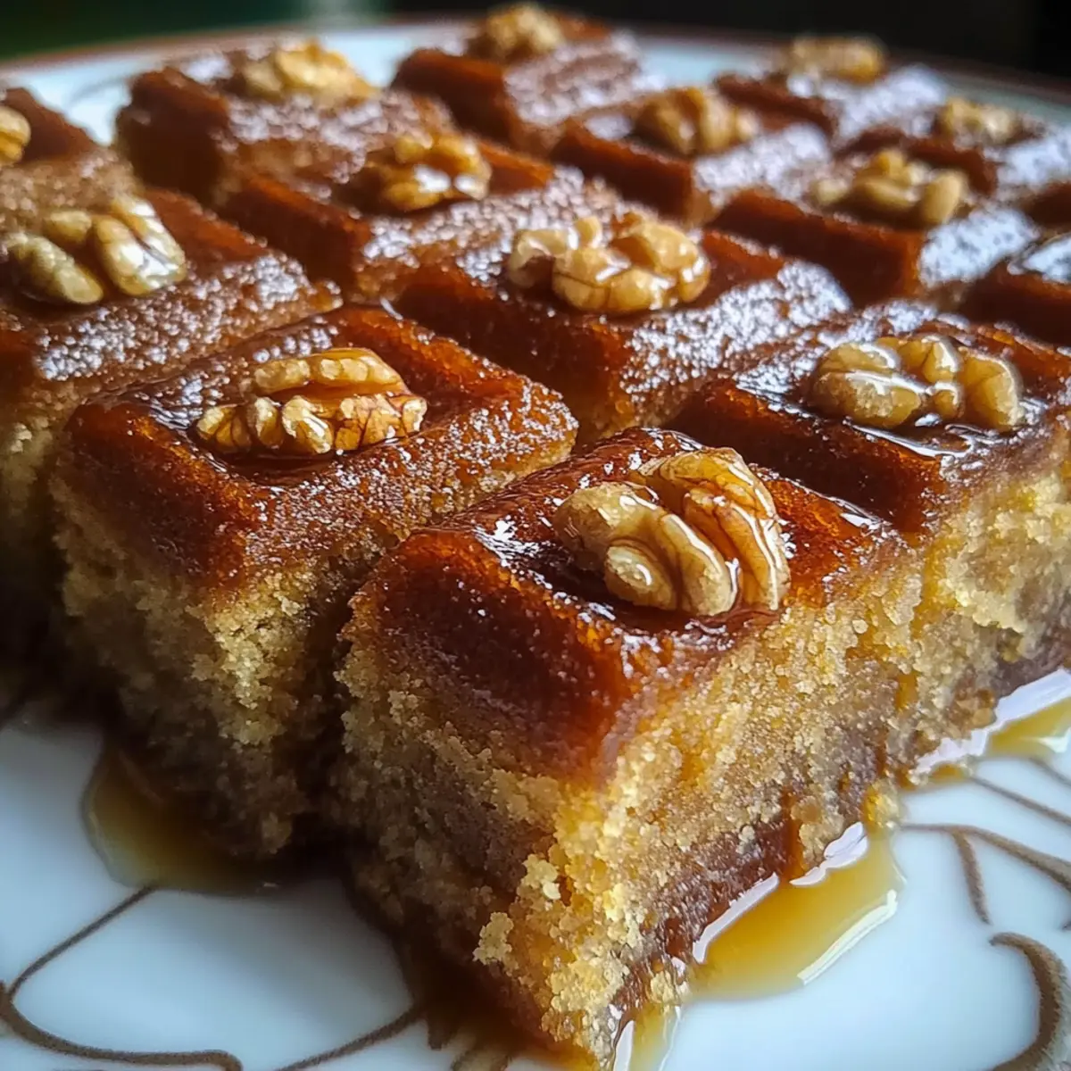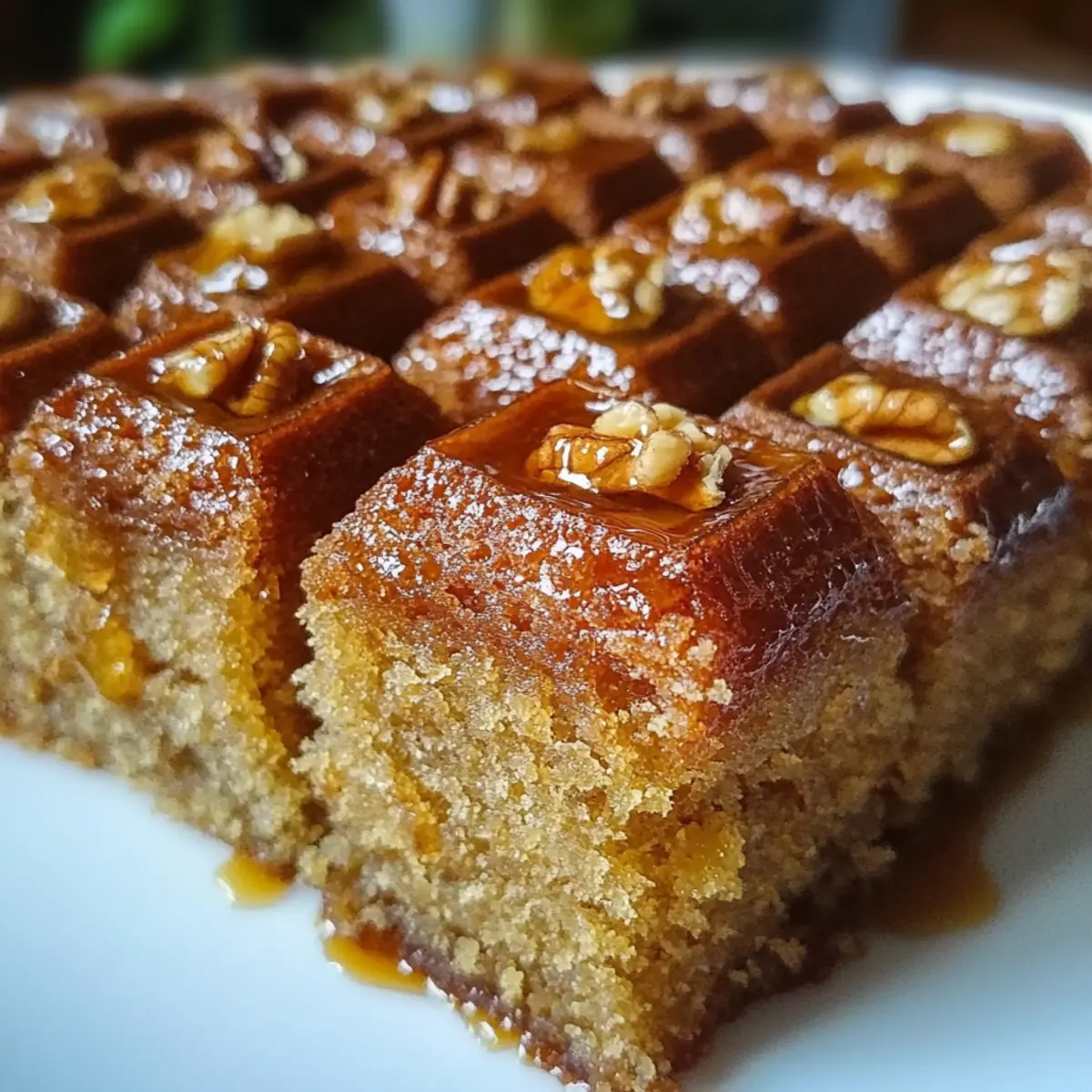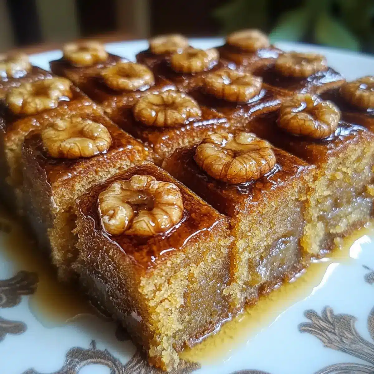 Once the cake is baked, remove it from the oven and allow it to cool for 10 minutes. Using a skewer or toothpick, poke holes all over the warm cake. Gradually pour the cooled honey syrup over the cake, allowing it to soak in deeply for that delicious sweet flavor.