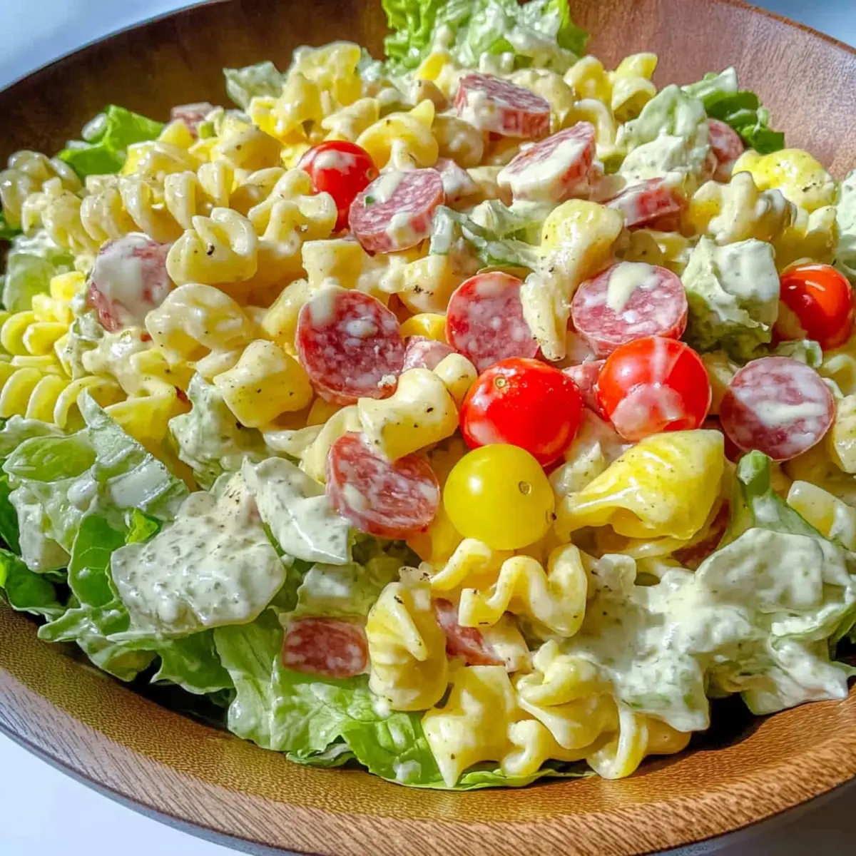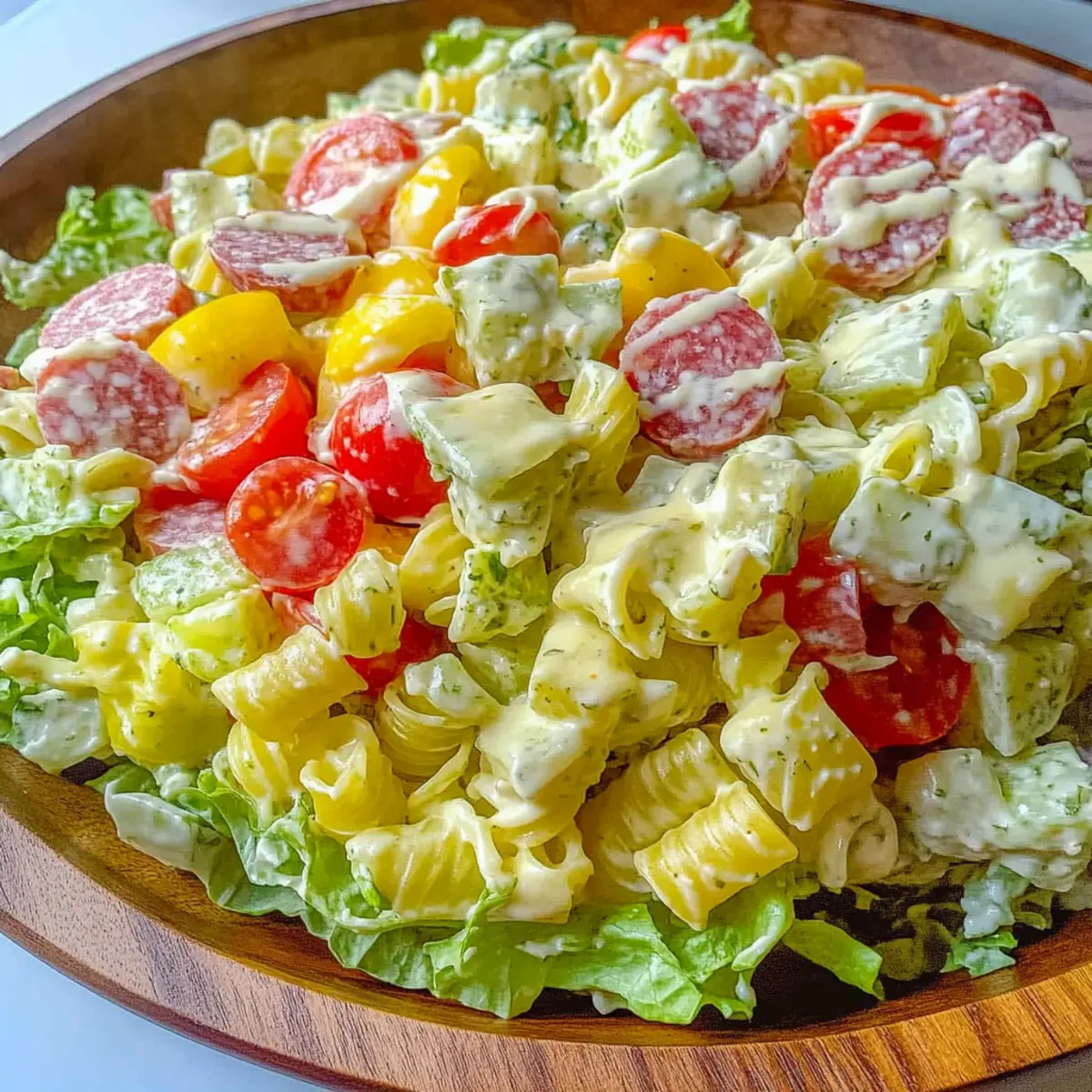 - In a large bowl, combine cooled pasta, lettuce, salami, cheese, tomatoes, cucumber, olives, and pepperoncini. Drizzle with olive juice and toss gently.