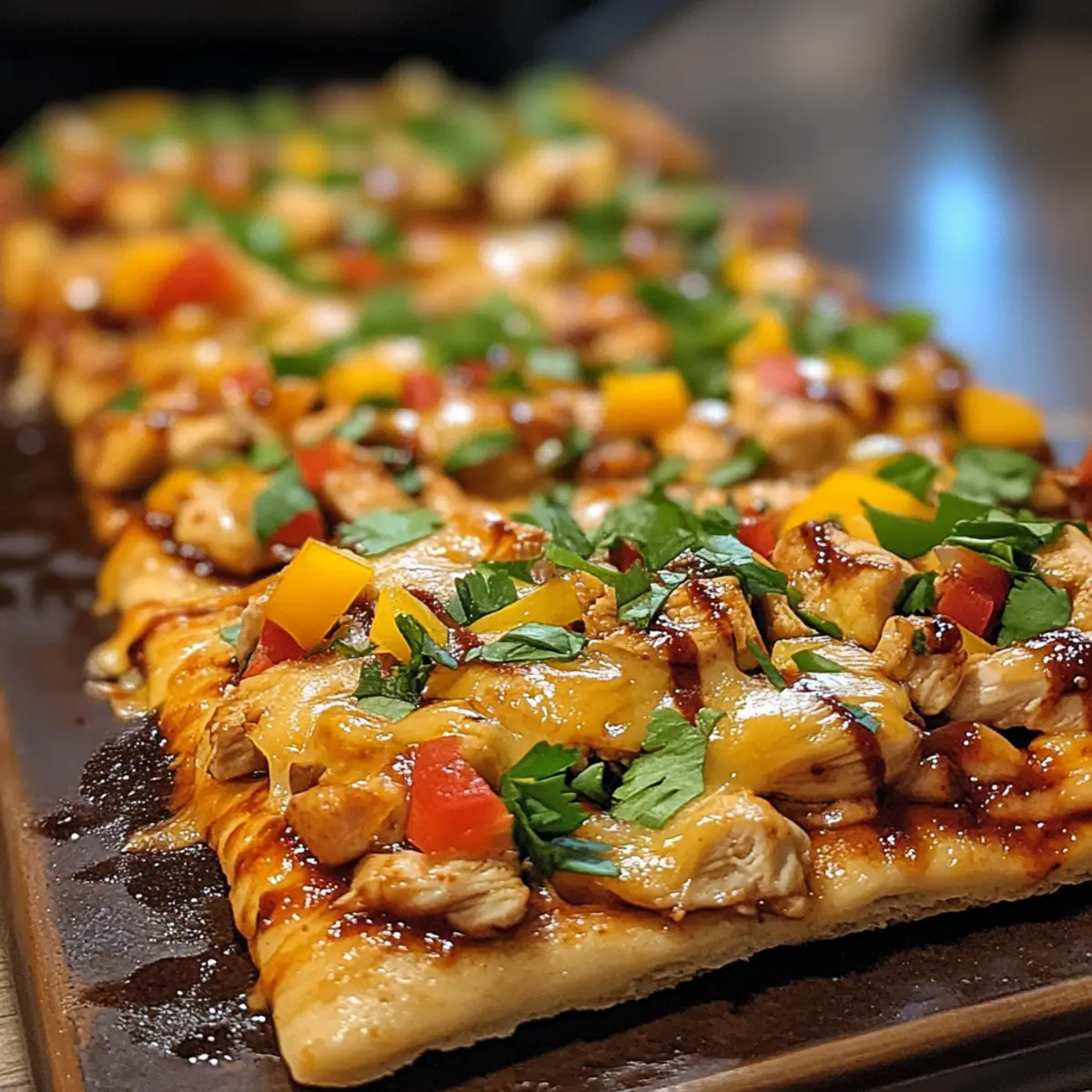 Scatter the diced or shredded grilled chicken evenly across the cheese, followed by a handful of chopped bell peppers. This colorful addition not only enhances the visual appeal but also adds a crunchy, fresh flavor contrast to the rich toppings on your High Protein BBQ Chicken Flatbread.