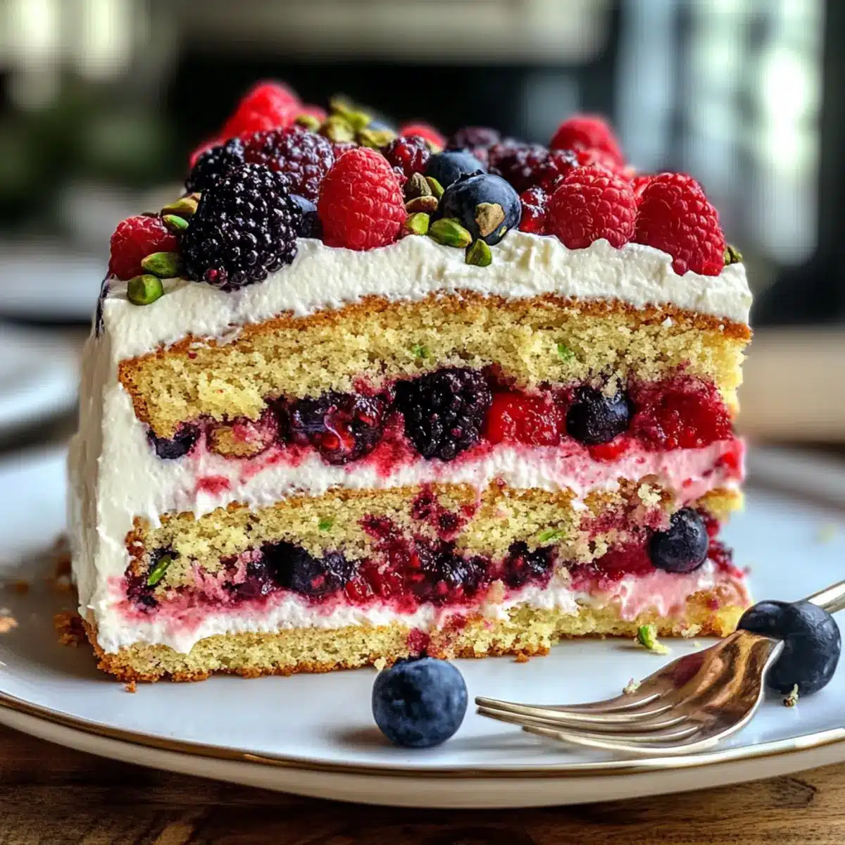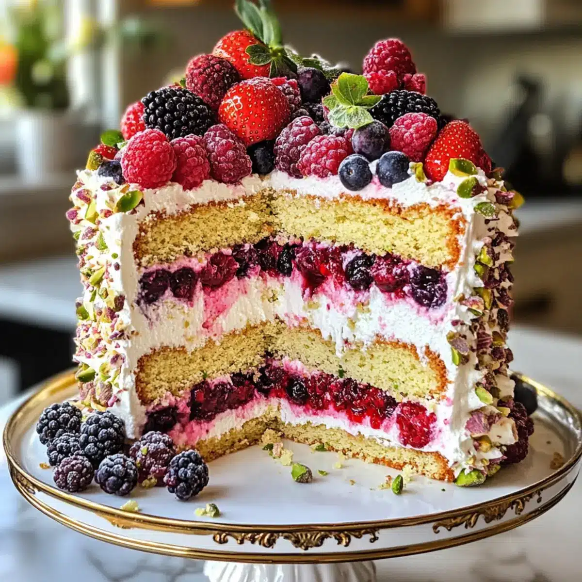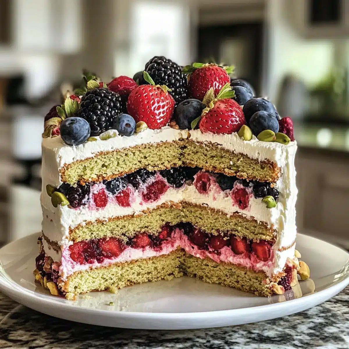 Decadent Layers: The Italian Berry Mascarpone Cake features a sumptuous pistachio sponge interlaced with creamy mascarpone, ensuring every mouthful is a luxurious treat.