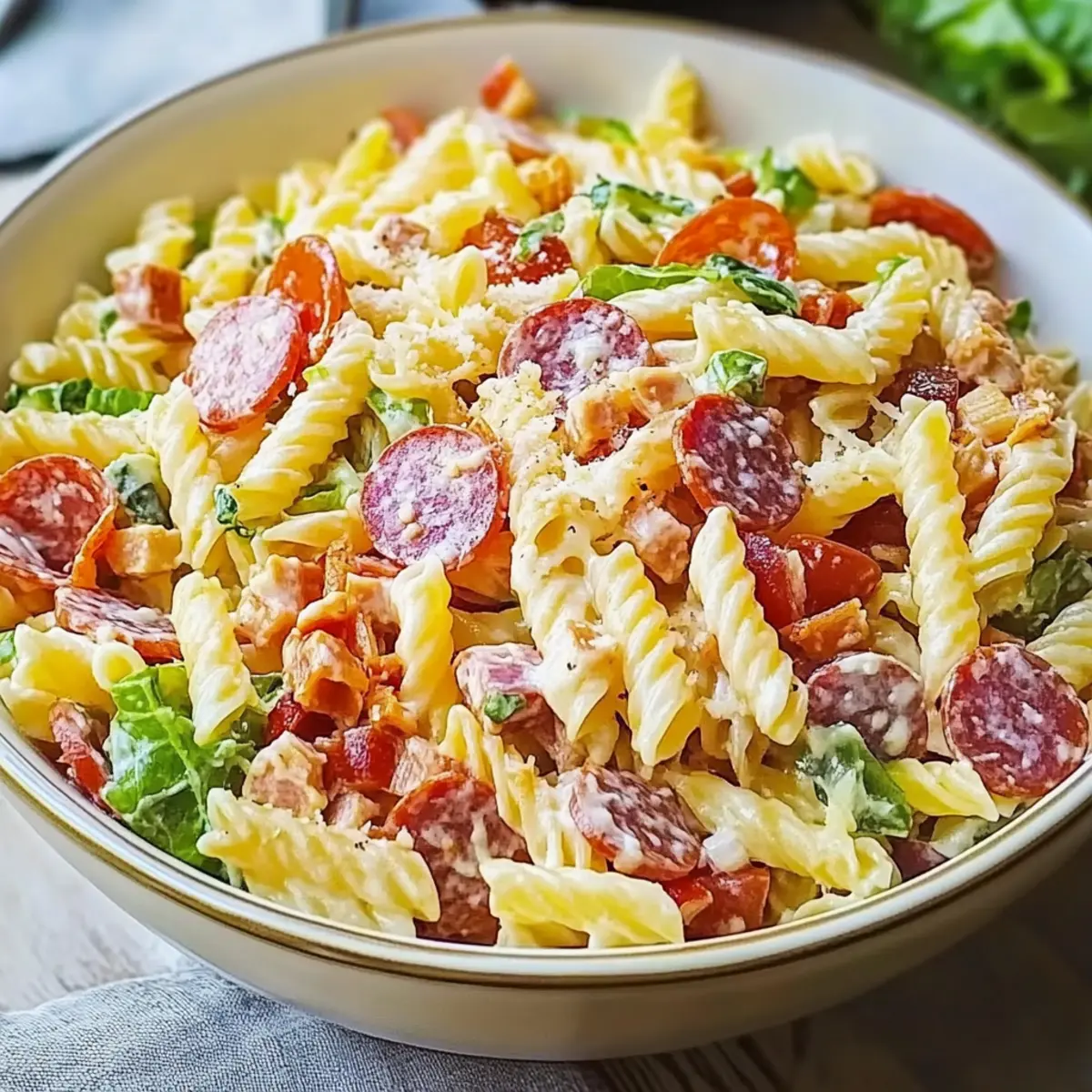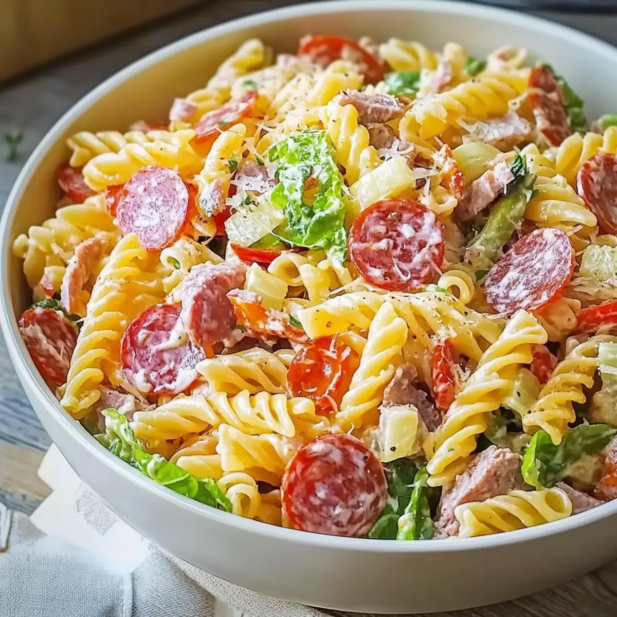 - Mix the Ingredients: In a large mixing bowl, combine the cooled pasta with pepperoni, salami, ham, lettuce, red onions, banana peppers, black olives, tomatoes, provolone, and Parmesan. Gently mix.