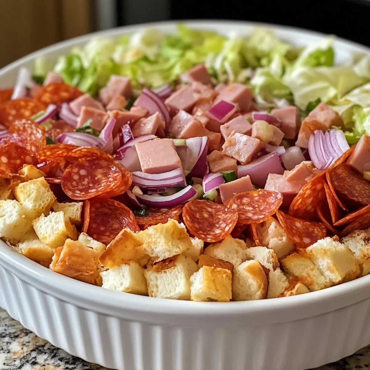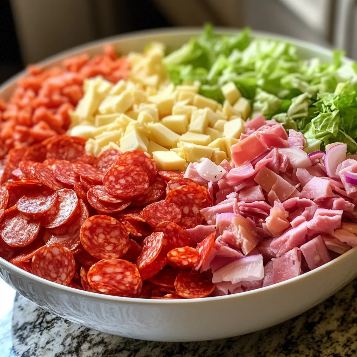 - Start by finely dicing 1 cup each of pepperoni, Genoa salami, and deli ham. Shred 1 cup of Provolone cheese and chop ¼ cup of red onion. Slice ¼ cup of hot banana peppers if using. Gather your tools: mixing bowl, knife, and cutting board.