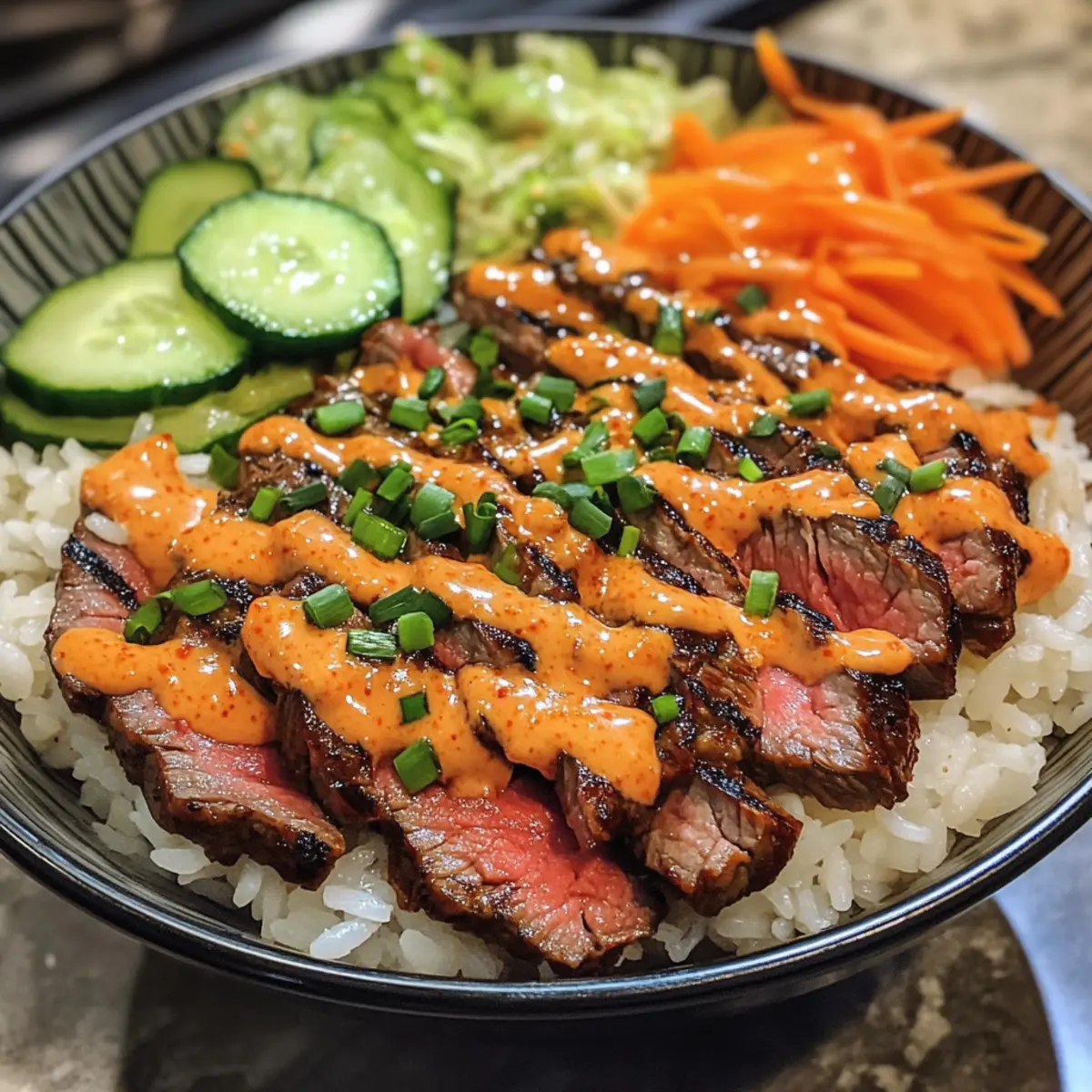- In serving bowls, place a scoop of cooked jasmine rice at the bottom, then top with sliced steak, chopped green onions, shredded carrots, and sliced cucumber.