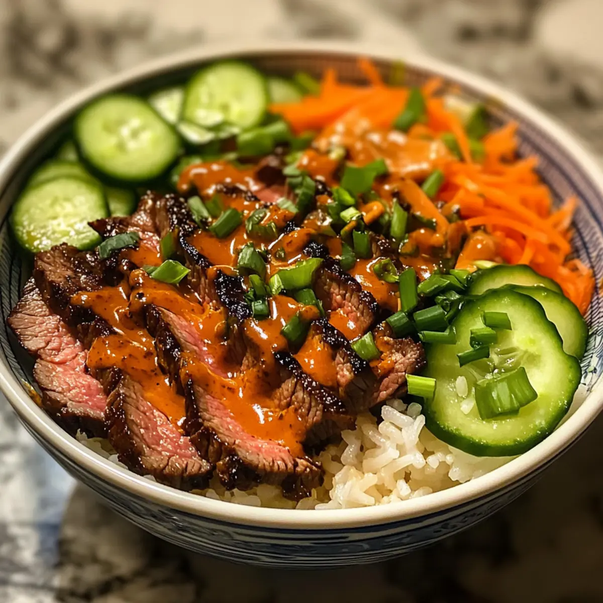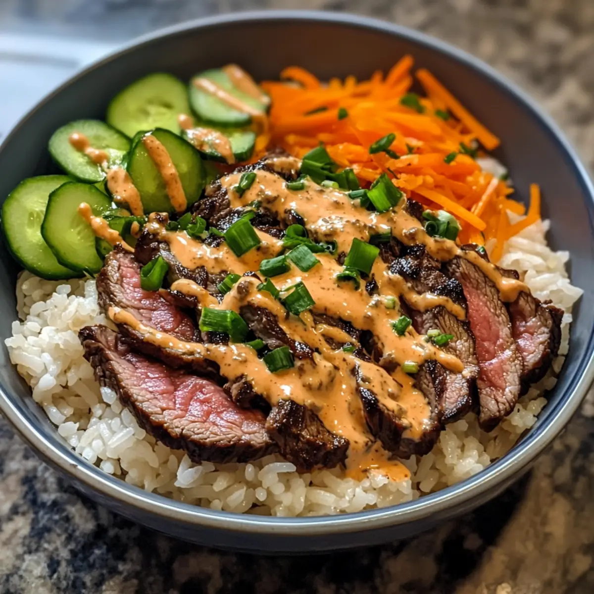 Prepare your serving bowls by placing a generous scoop of cooked jasmine rice at the bottom. Top each bowl with sliced steak, creating a beautiful display. Add chopped green onions, shredded carrots, and sliced cucumber to finish the assembly, ensuring a mix of vibrant colors and textures. Each bowl should look inviting and fresh.