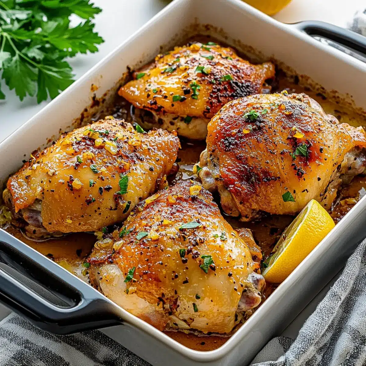 - Arrange the Chicken: Transfer marinated thighs to the baking dish, skin side up, spacing them out for crispy skin.