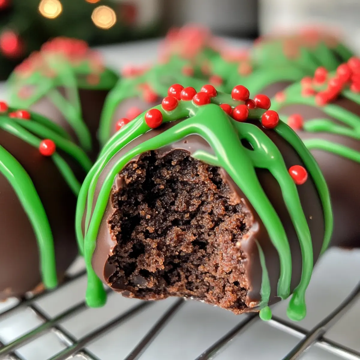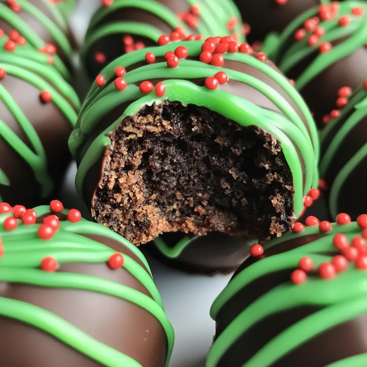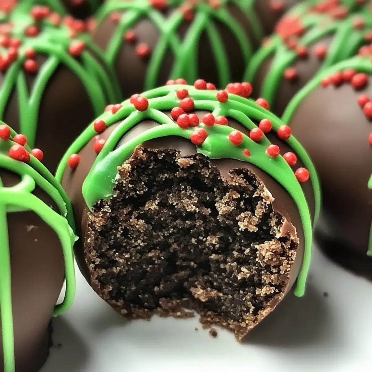 - While the chocolate coating is still wet, drizzle melted green candy melts over the truffles and sprinkle with red sprinkles.