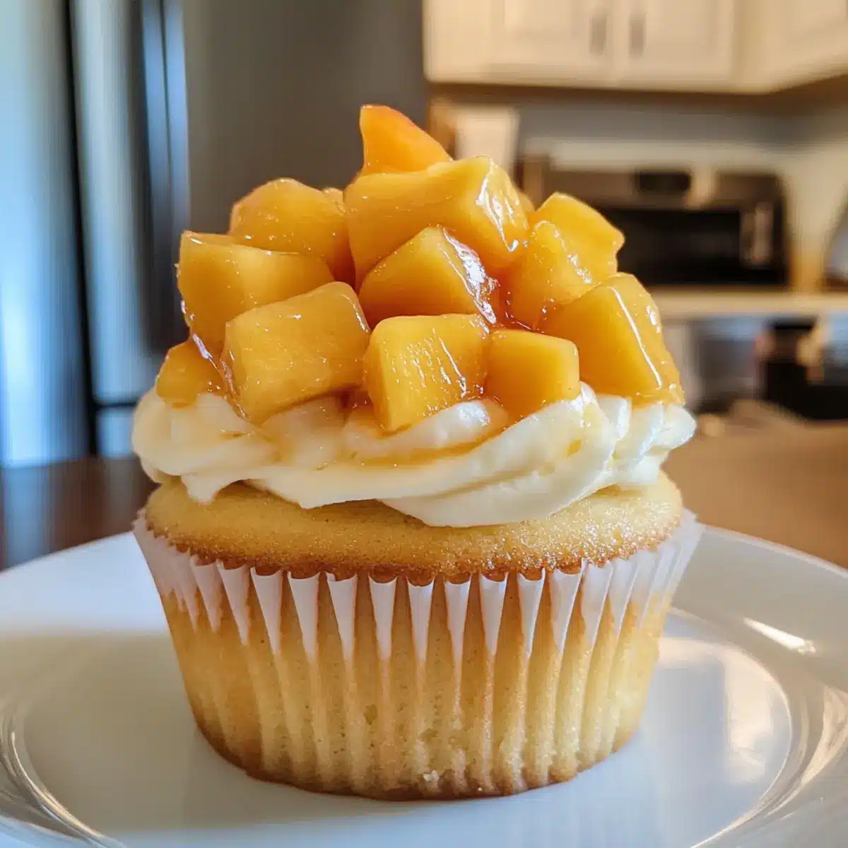 - After cooling, spoon the peach topping over each cupcake and garnish if desired.