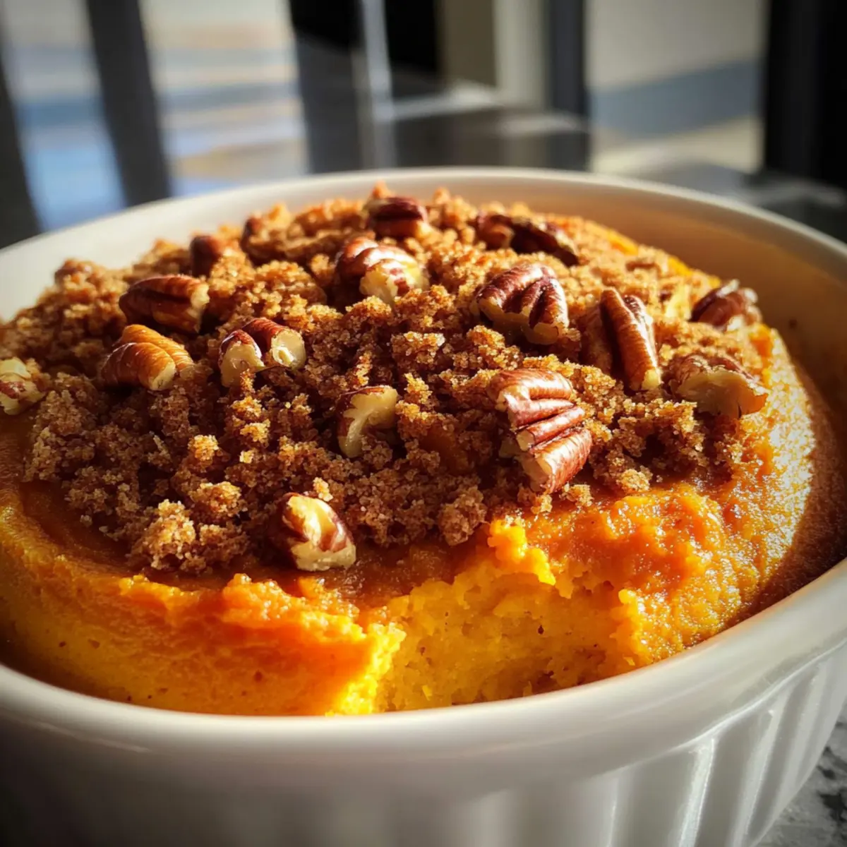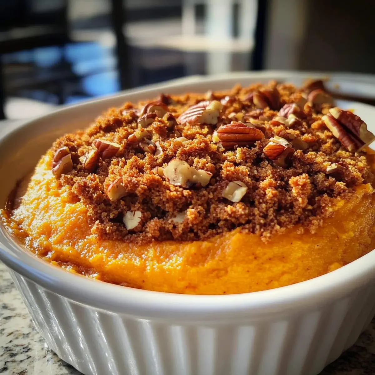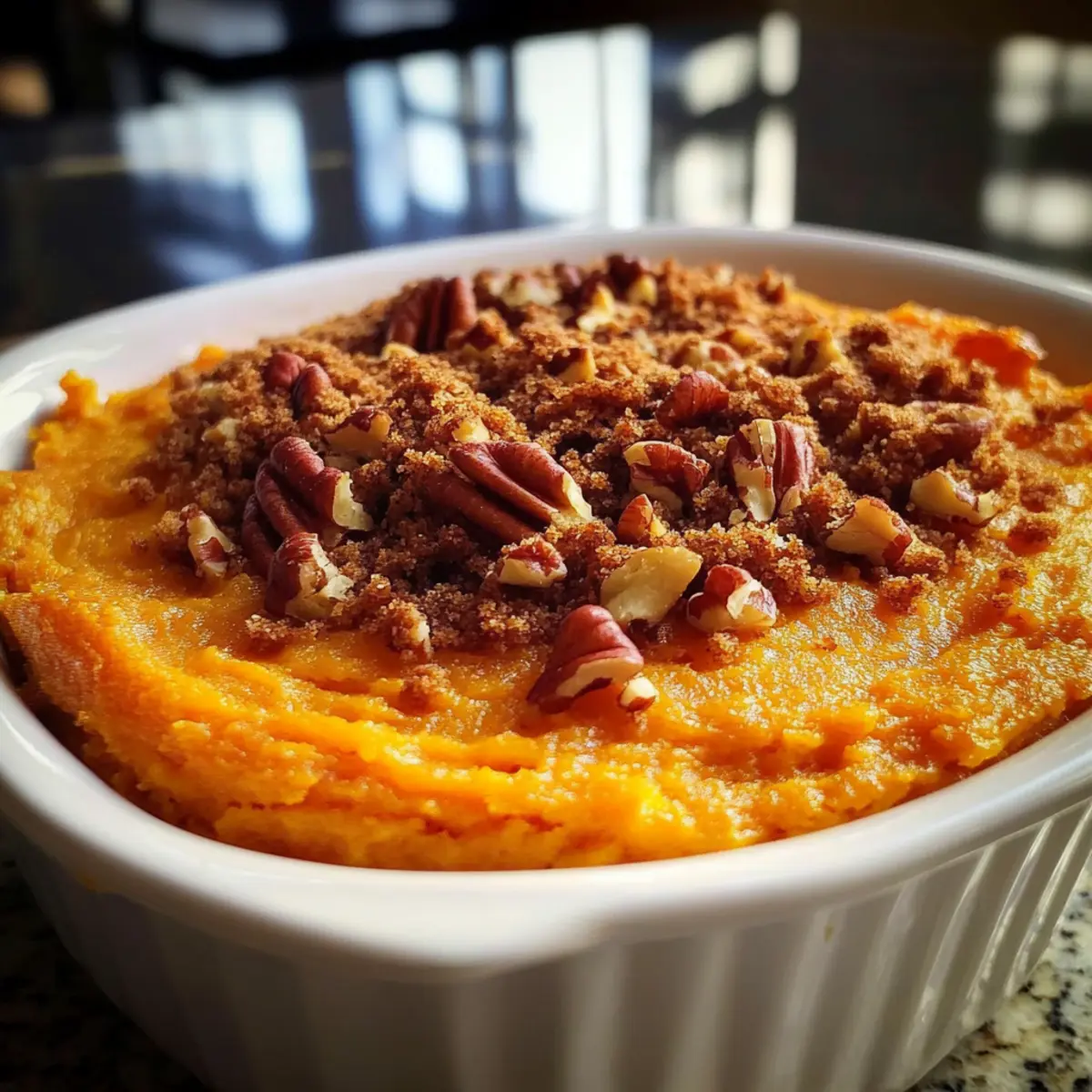 - Spread the pecan topping evenly over the sweet potato mixture.