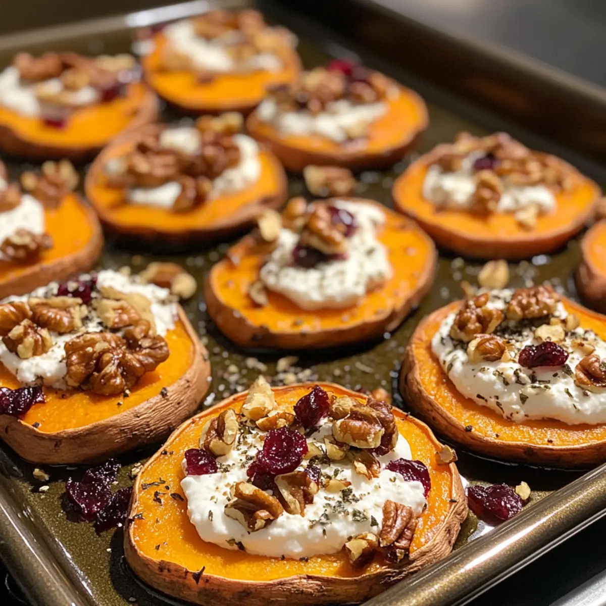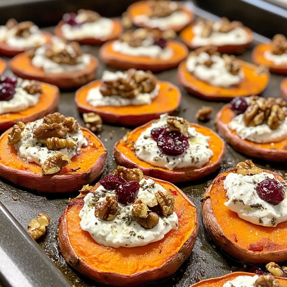 Dive into this delectable recipe and indulge in the comforting essence of Roasted Sweet Potato Rounds with Herbed Ricotta, Walnuts, and Cranberries!