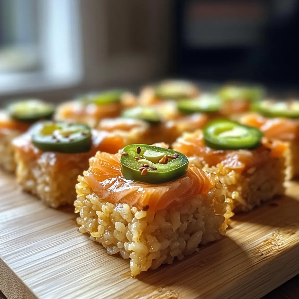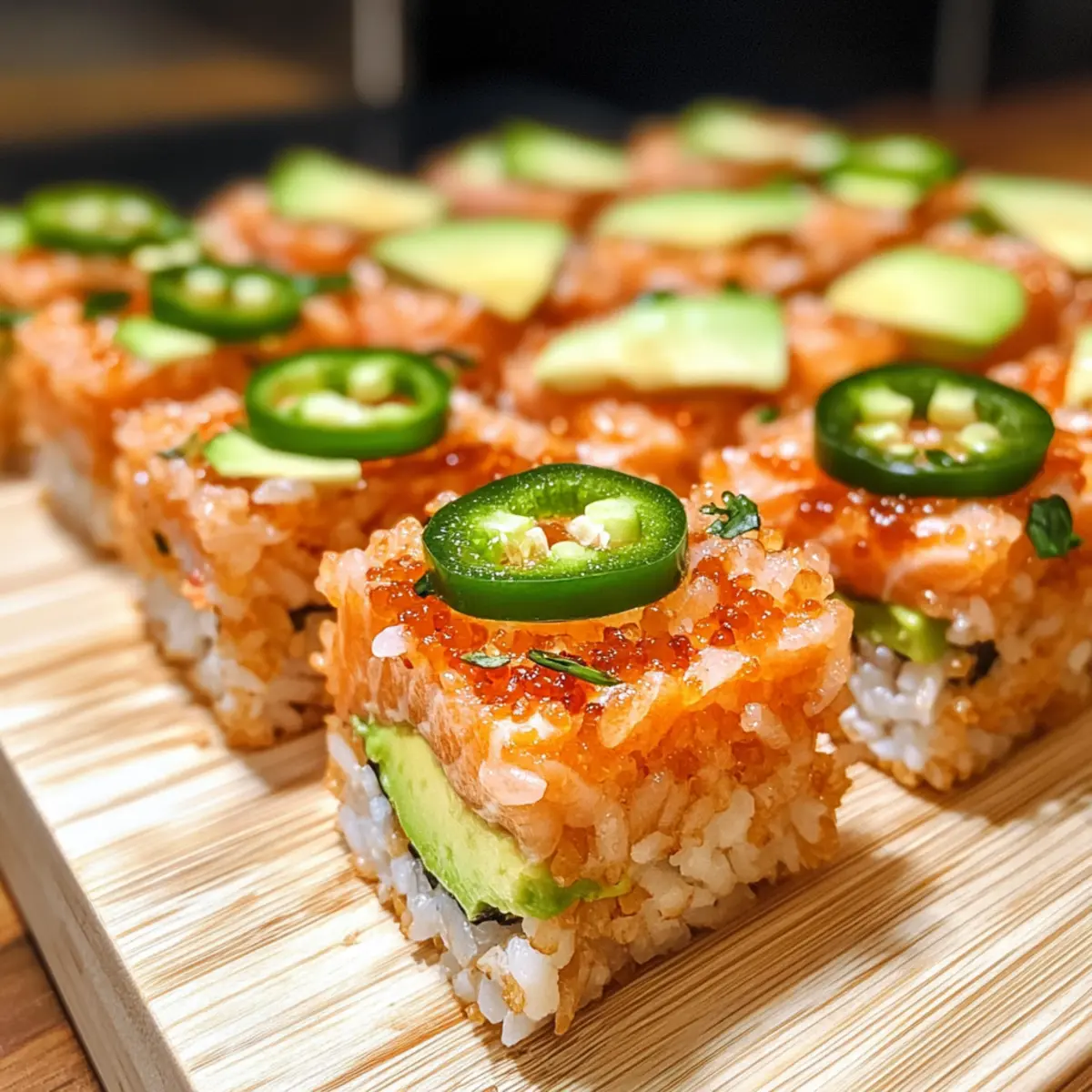 - Top each rice square with a spoonful of salmon mixture and a slice of avocado, followed by jalapeño slices.