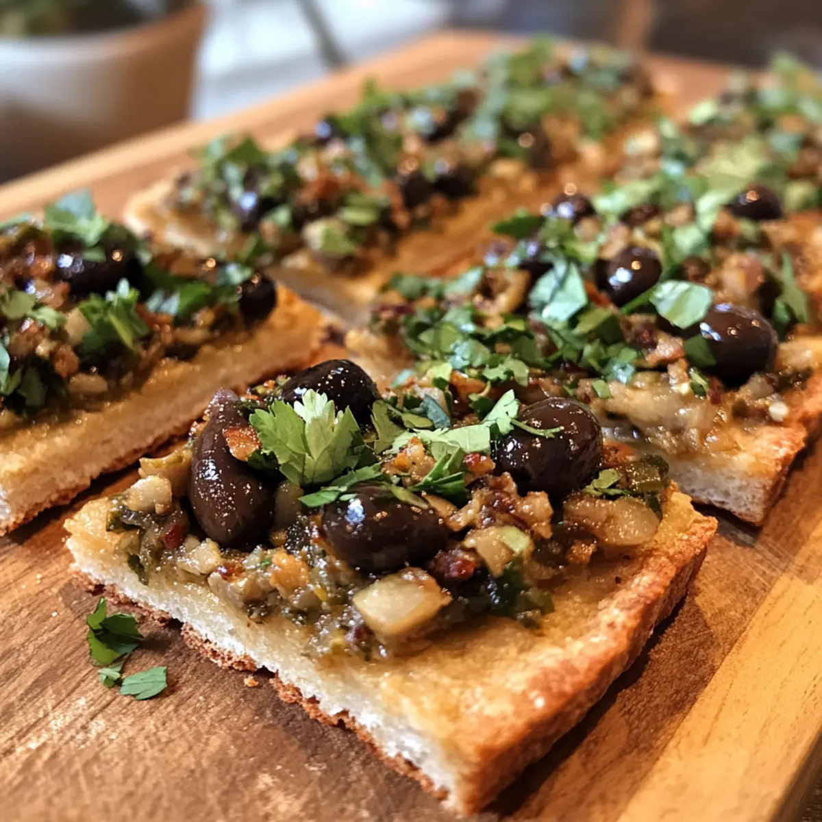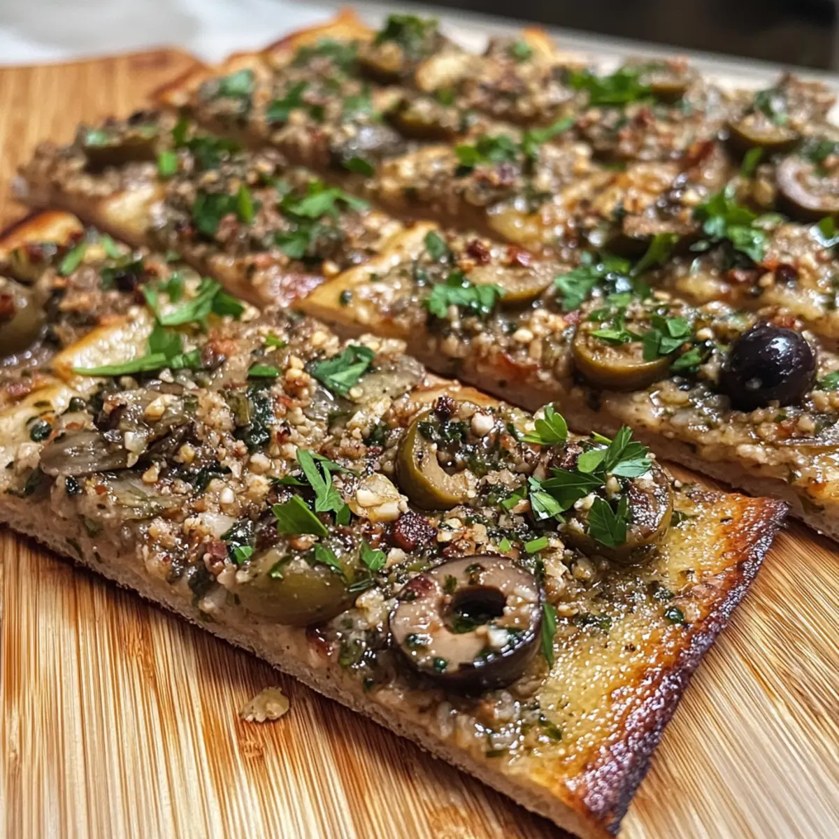 - Spread the tapenade over the flatbread, slice, and serve.