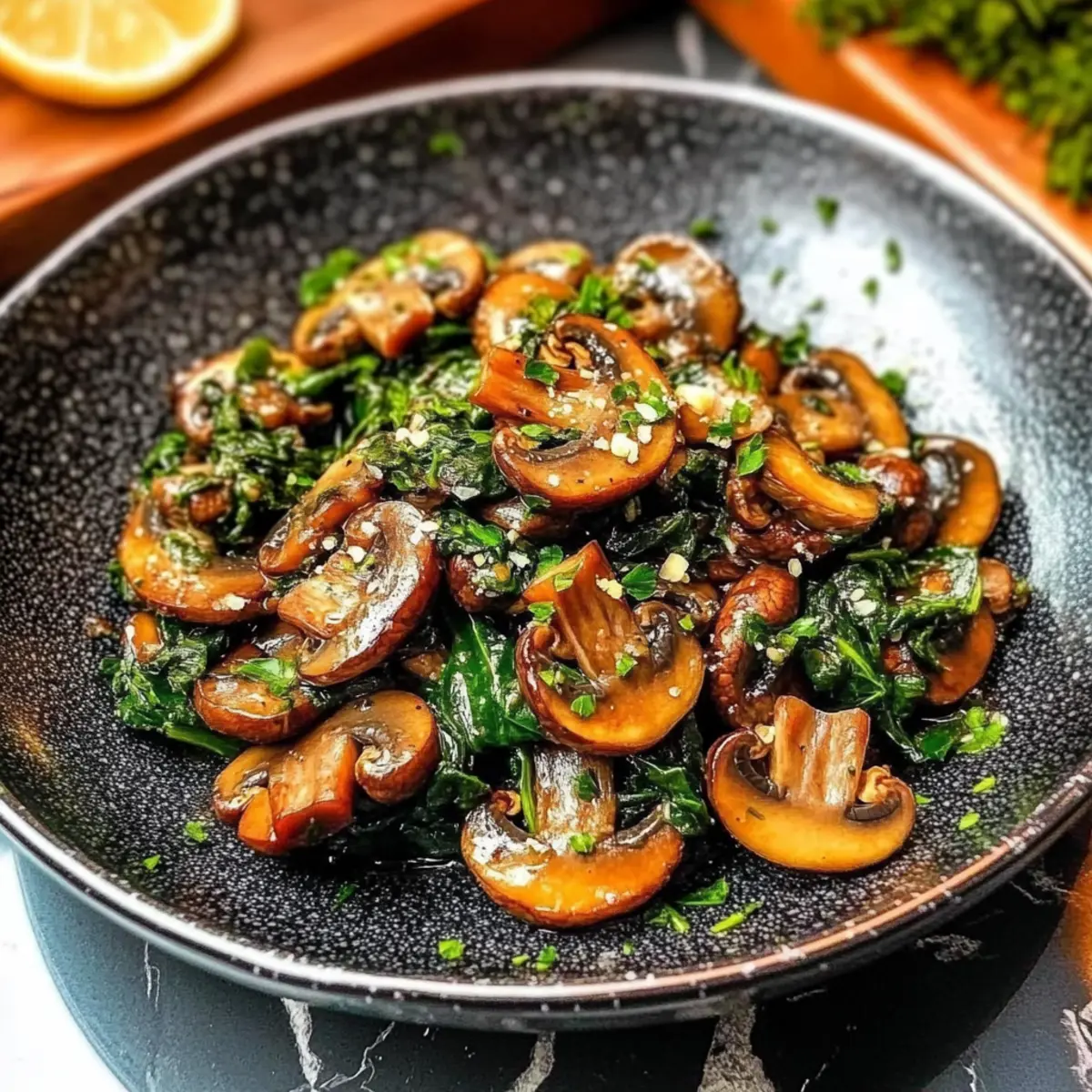 Once the spinach is tender and bright green, season the dish with salt and freshly cracked black pepper to taste. Drizzle in the freshly squeezed lemon juice, tossing everything together to combine all the flavors. The acidity from the lemon will brighten the sautéed mushrooms with spinach, enhancing the overall taste profile.