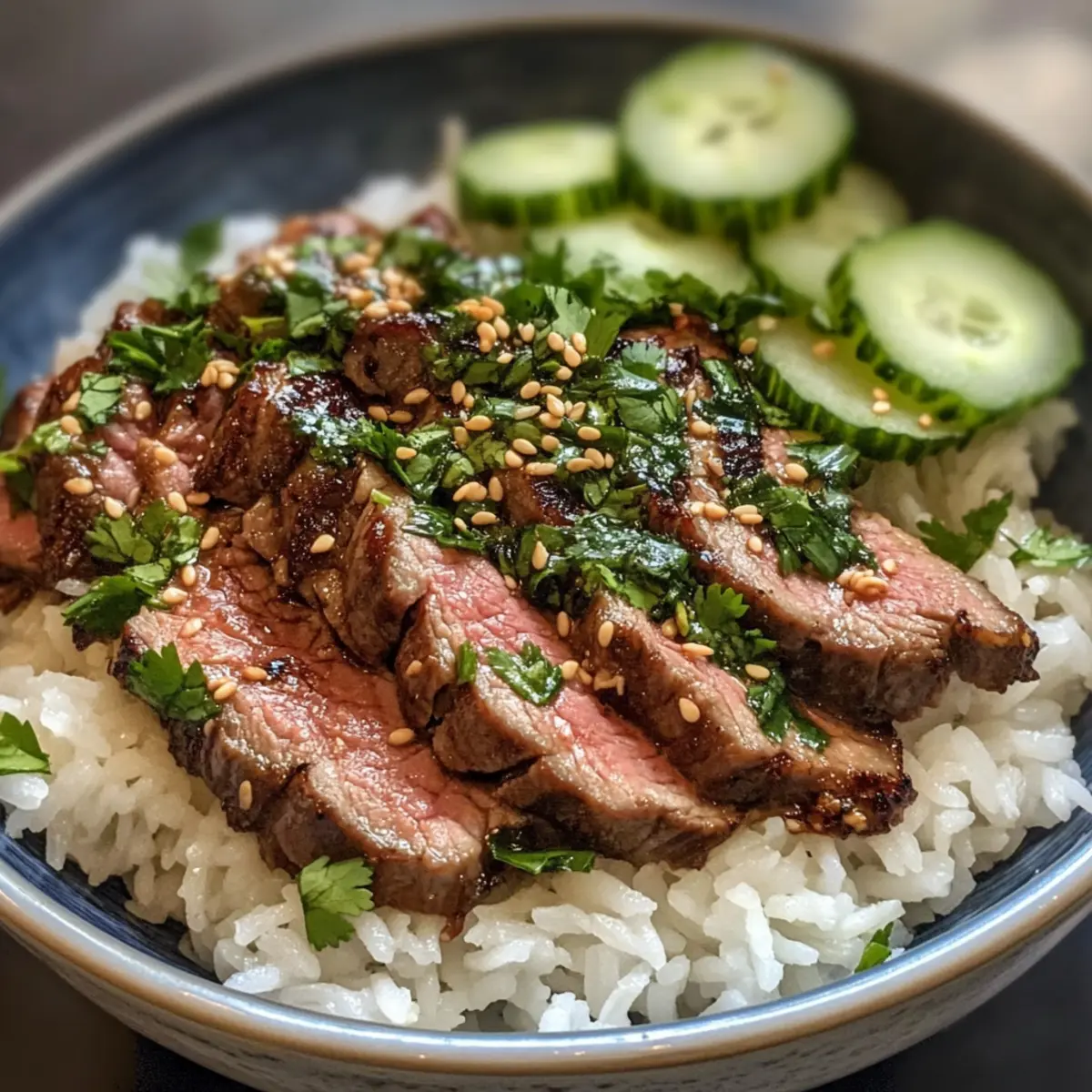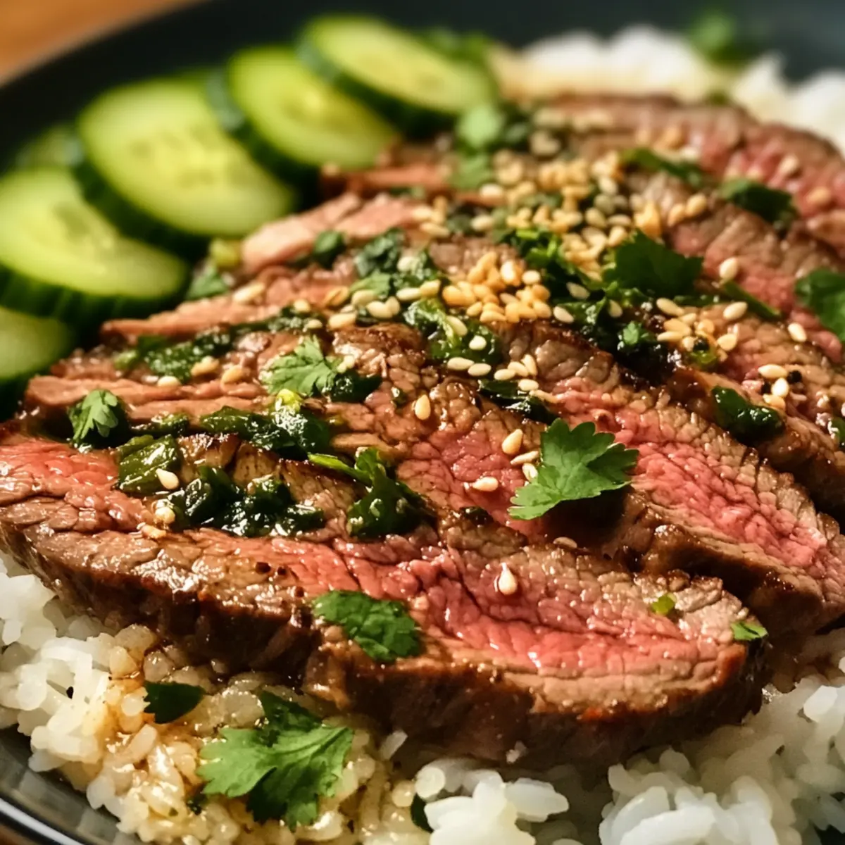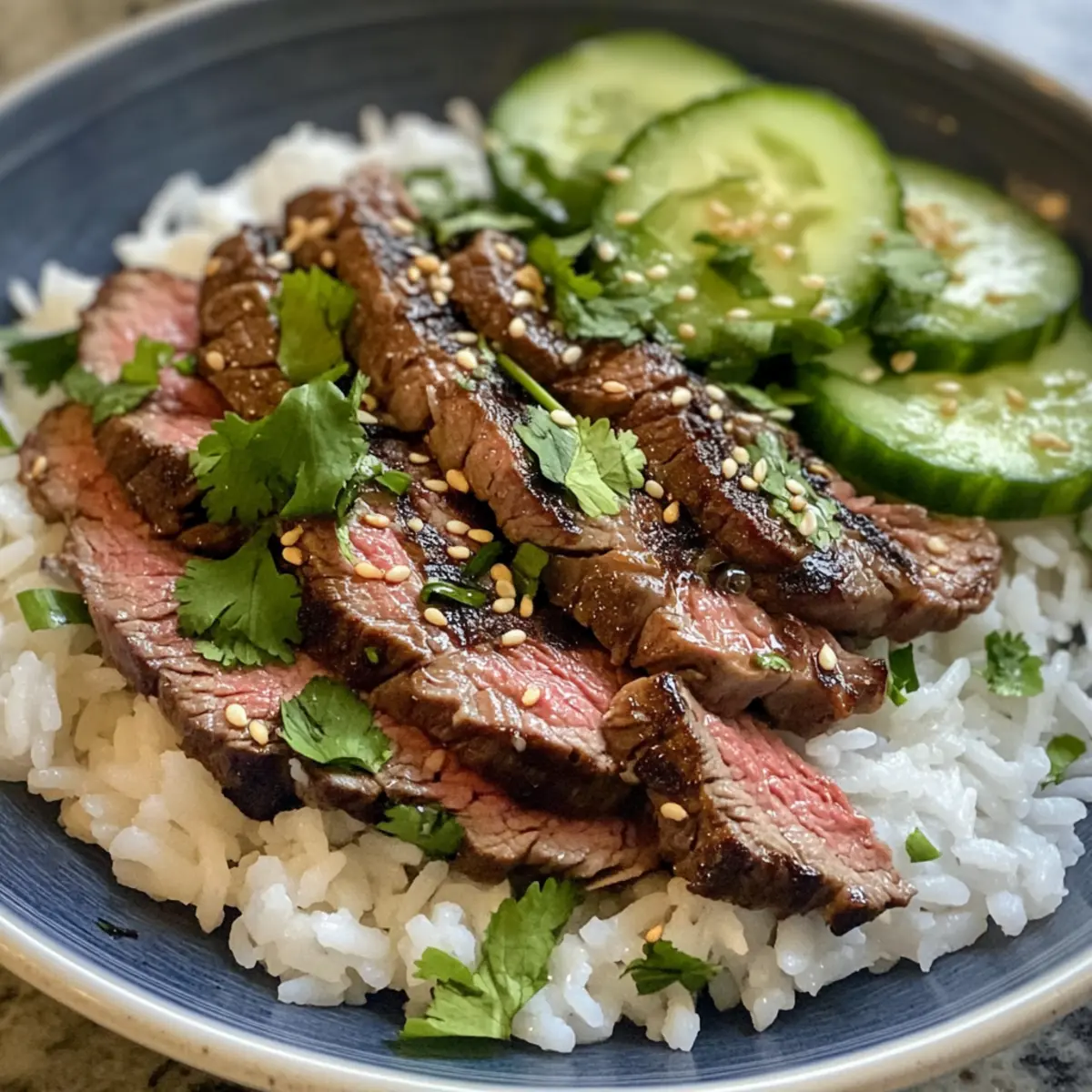 - To serve, place jasmine rice on each plate, top with steak slices, and garnish with cilantro and cucumber. Optionally drizzle with leftover marinade.