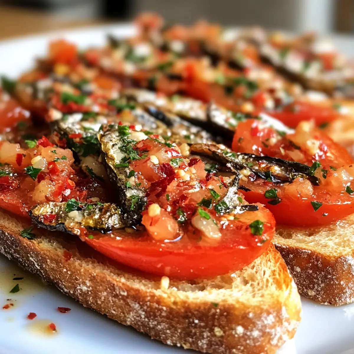 Finally, sprinkle a pinch of red pepper flakes over each toast for a subtle kick, and drizzle with hot honey if you’re looking to introduce a touch of sweetness and heat. This final flourish elevates your Tomato Sardine Toast, ready to delight your guests with Mediterranean flair!