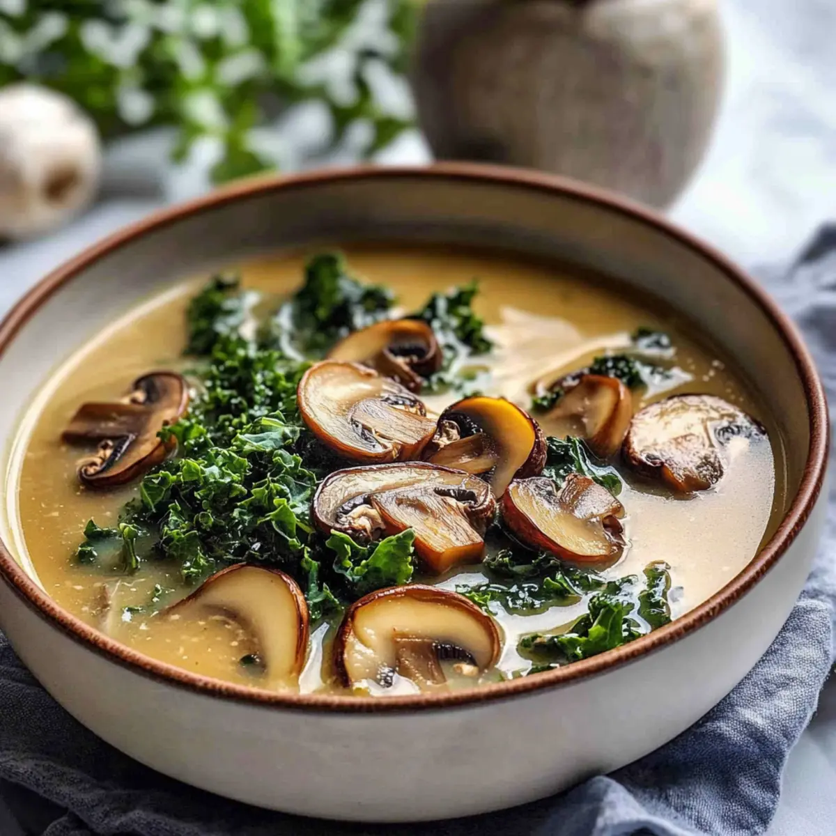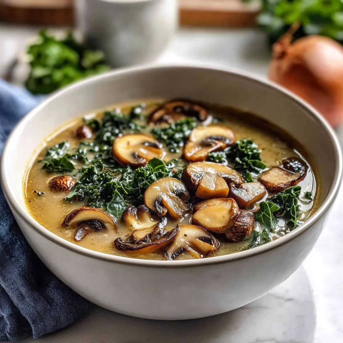 Comforting Wild Mushroom, Caramelized Onion and Kale Soup